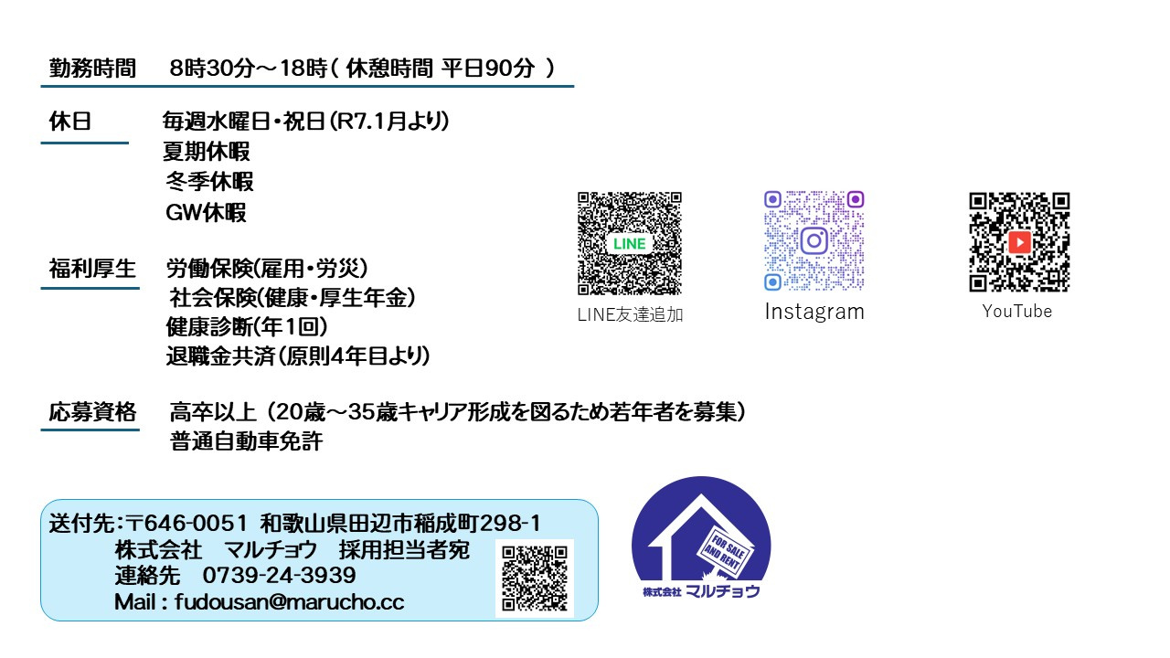 正社員募集中 RECRUIT 2026.01.09 #お部屋探し/田辺市賃貸/1人暮らしのお部屋/マルチョウ不動産/田辺市不動産 #採用情報 #スタッフ募集 #売買仲介 #賃貸仲介 #賃貸管理 #相続物件 #売却査定 筆者 小川 勇人 不動産キャリア37年 いいところは何?って、「運がいい」の一点です。
